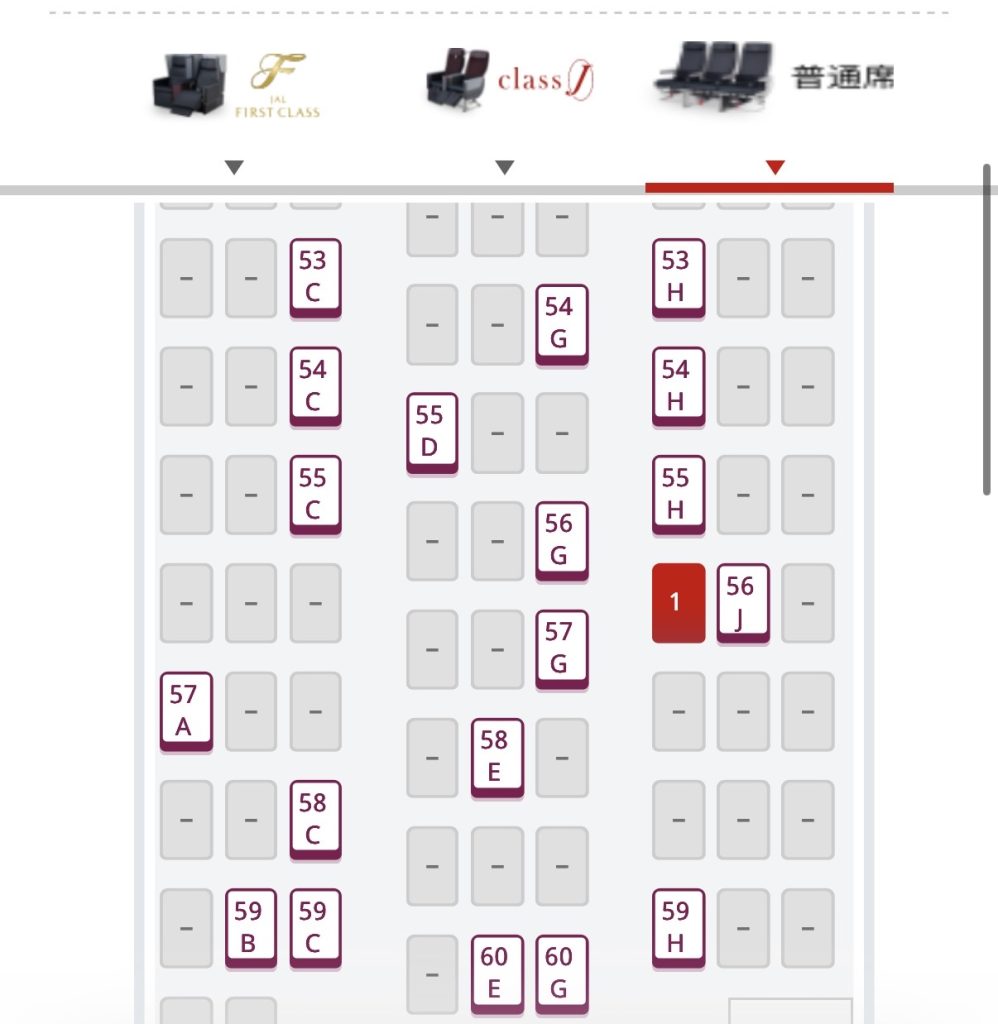 56Hをしていた状態で、購入前の方に見える検索画面の座席を見てみると、56Hのほか、56Jも指定できないようになっていました。