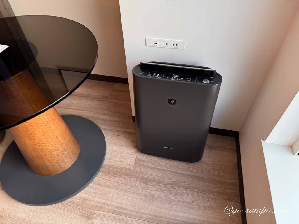 北陸の冬は空気が乾燥しやすいため、ホテルの加湿環境はとても重要です。客室には加湿機能付き空気清浄機が常設されており、到着時から適度な湿度に保たれています。