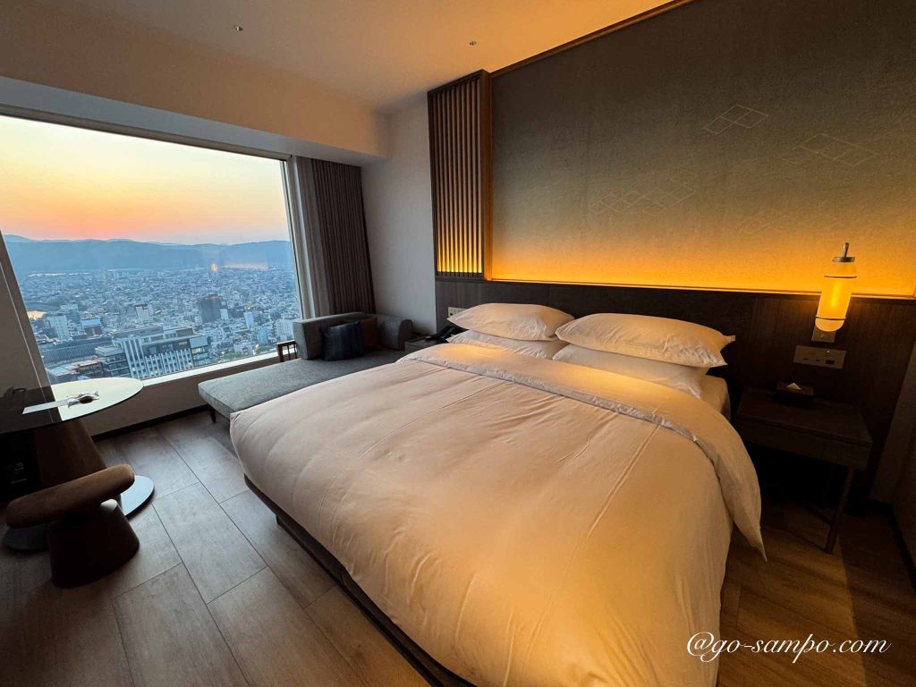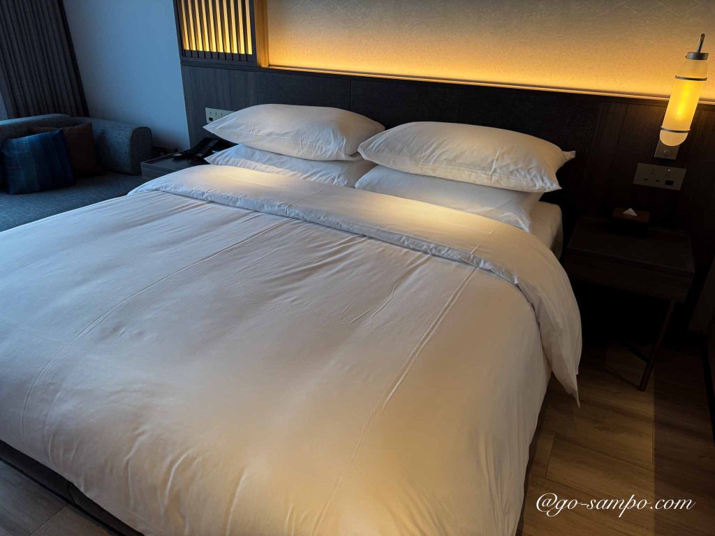 宿泊したのは、ゆとりあるダブルベッドルーム。木の温もりを感じるナチュラルモダンな内装で、落ち着いた雰囲気の中にもマリオットらしい上質感があります。子ども連れでも安心して過ごせるよう、スペースに余裕があり、動線もスムーズです。