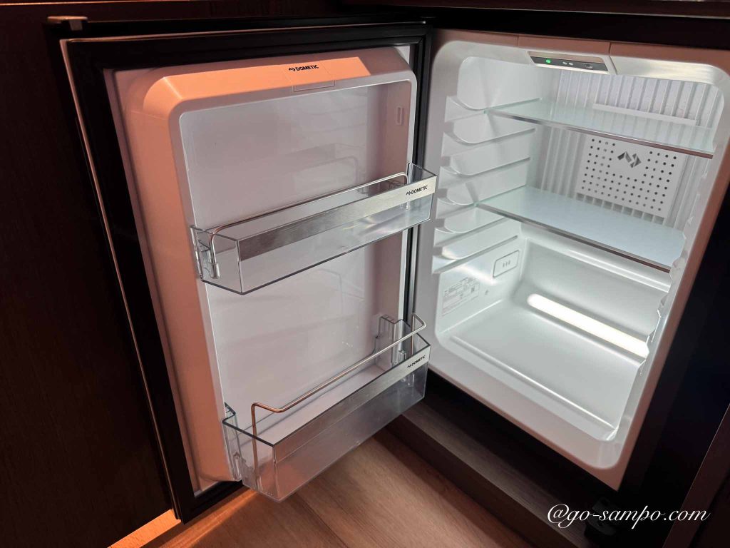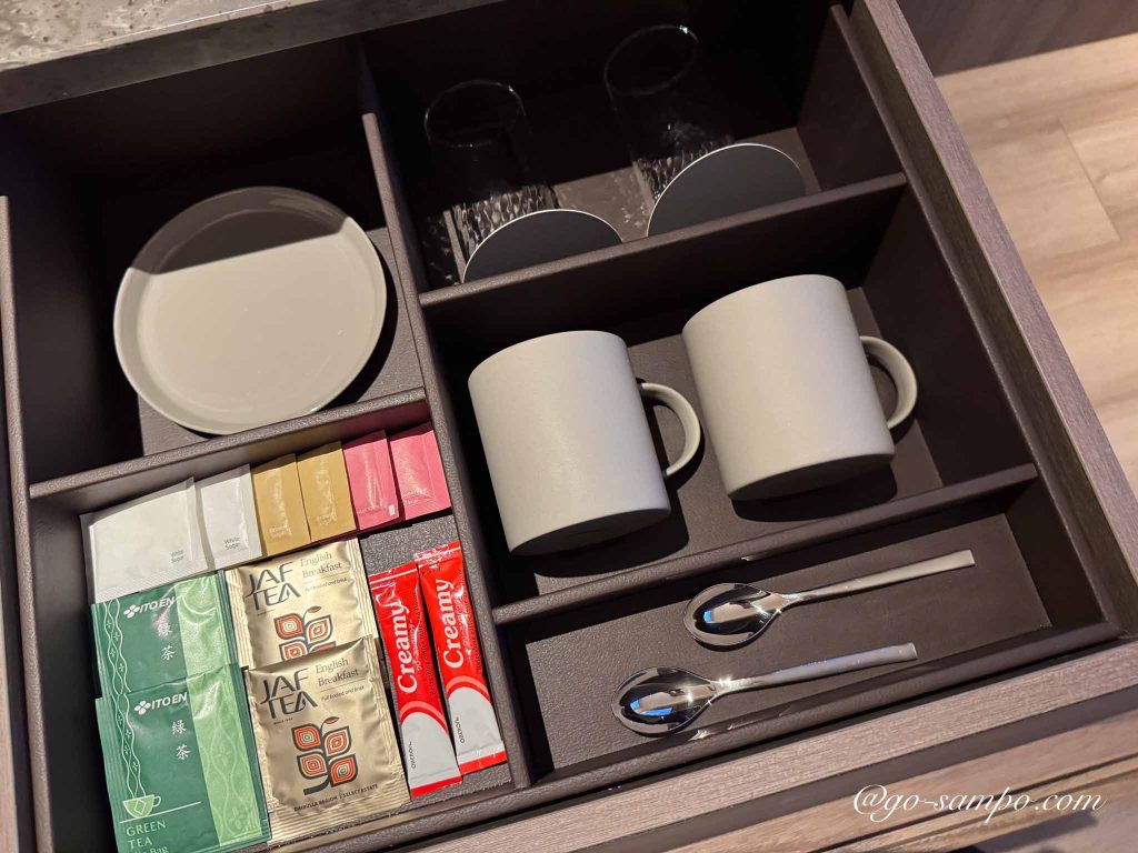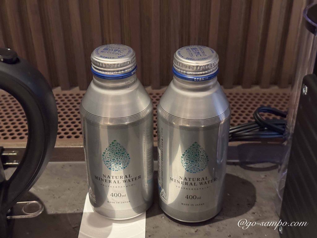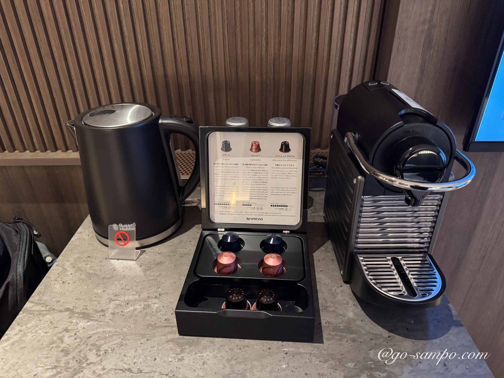 ミネラルウォーター、ネスプレッソマシン、電気ケトル、冷蔵庫も完備。ミルク用のお湯を作るのにも十分対応できます。