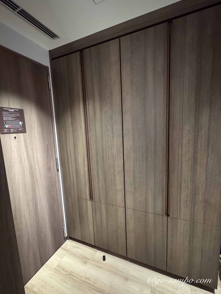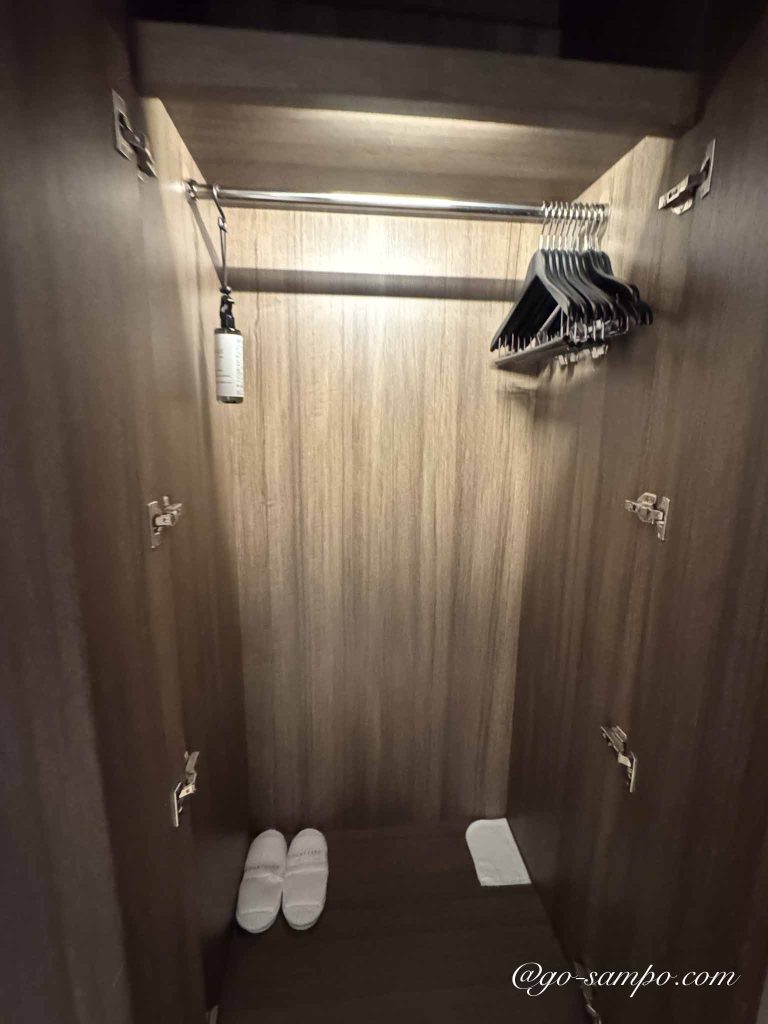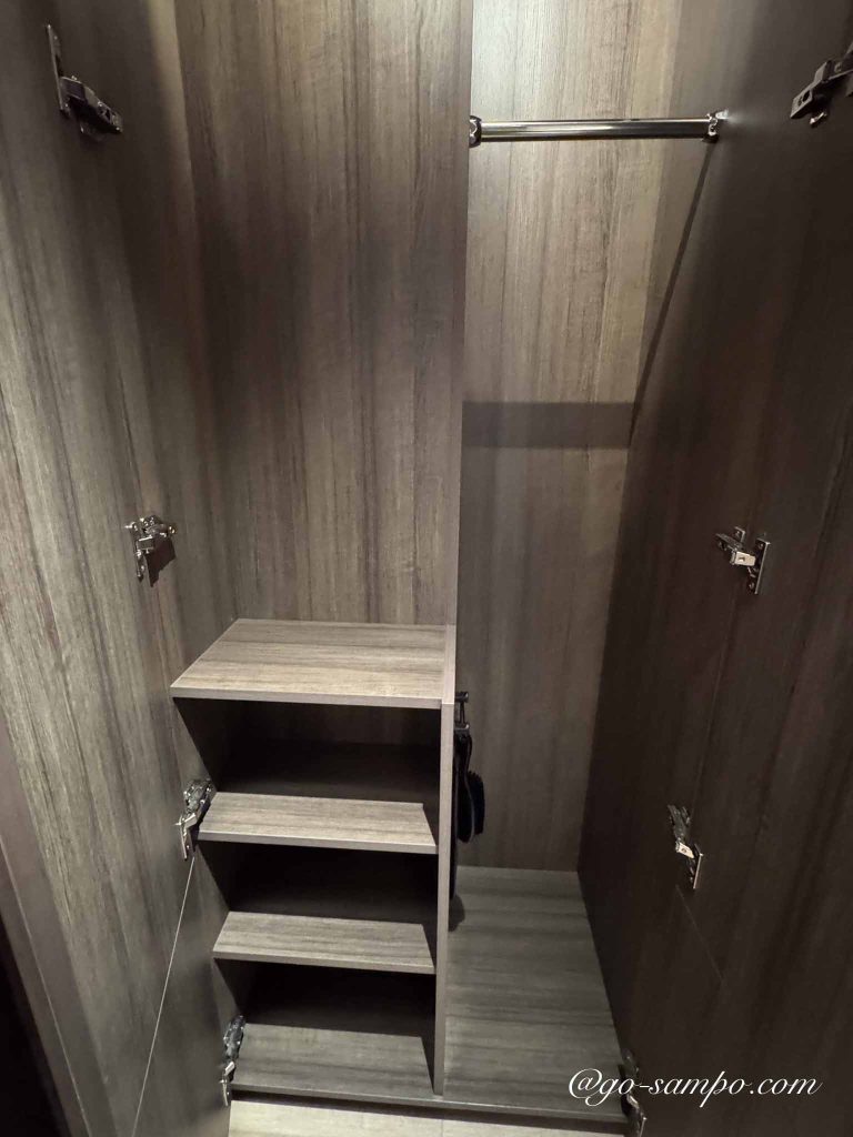 入口付近にはクローゼットがあり、ハンガーやアイロン台、靴べら、スリッパなどが整然と並びます。