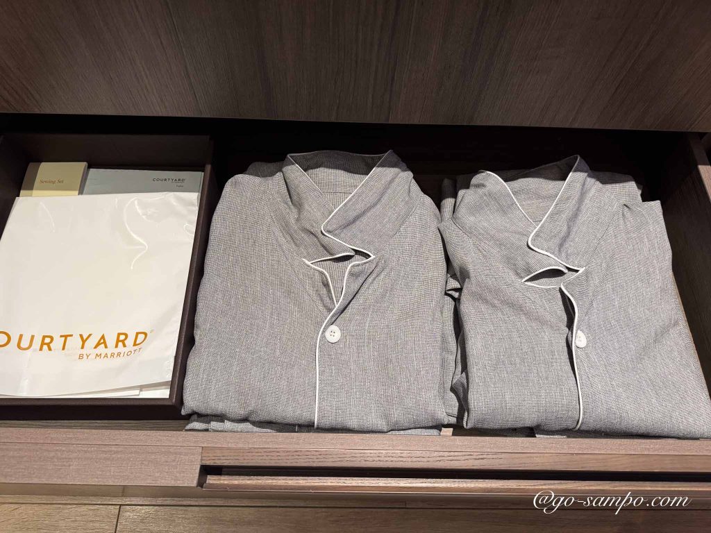 客室には、上下セパレートタイプのパジャマが用意されています。やわらかなコットン素材で、肌ざわりがとても優しく、冷暖房の効いた室内でも快適に過ごせる軽やかな着心地です。