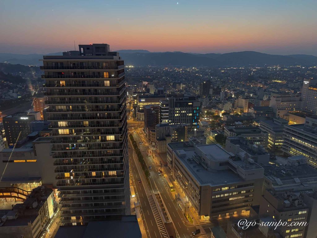 夜になると一転して、駅前通りのライトアップが輝き、しっとりと落ち着いた雰囲気に。25階という高さだからこそ、福井の街全体がパノラマのように広がります。窓際のソファから夜景を眺めながらコーヒーを飲む時間は、まさに旅のご褒美でした。
