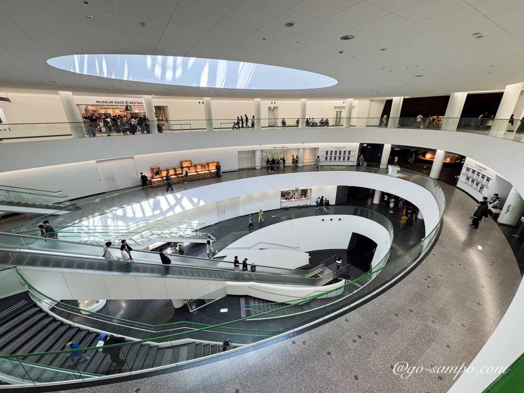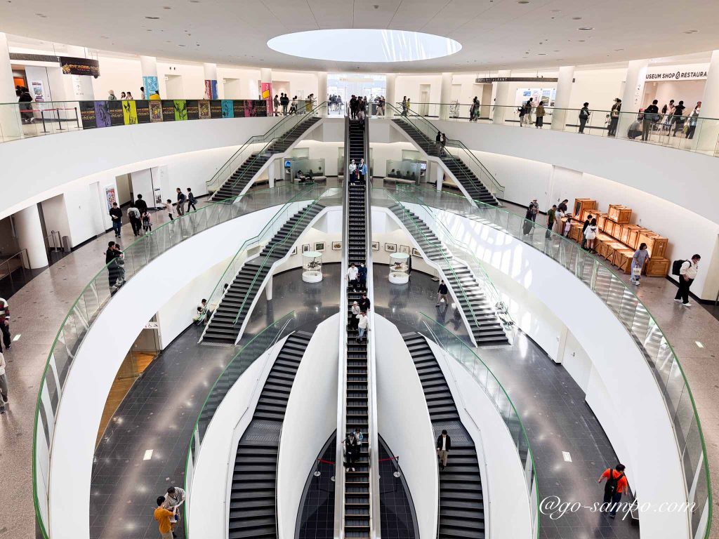 エントランスホールから展示室へ下るエスカレーターの空間演出は、まさにこの博物館の象徴といえるでしょう。