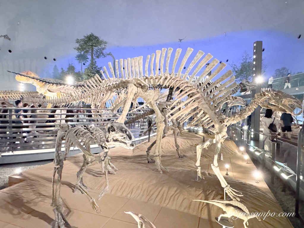 スピノサウルスの全身骨格複製をはじめ、最新の恐竜研究成果を反映した展示が並び、迫力と学びの両面から楽しめる内容です。
