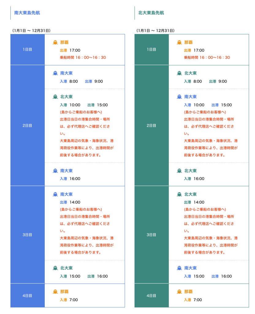 なので、那覇から南北大東島に行く便を予約したい人は、那覇出発日と行き先を確認すればOK(北先行に乗って南大東島に行きたい場合は、北大東島を経由していくことになりますね)、南北大東島間を移動したい人は、那覇出発日翌日またはその翌日に南北間の移動があるのでその便を予約することになります。