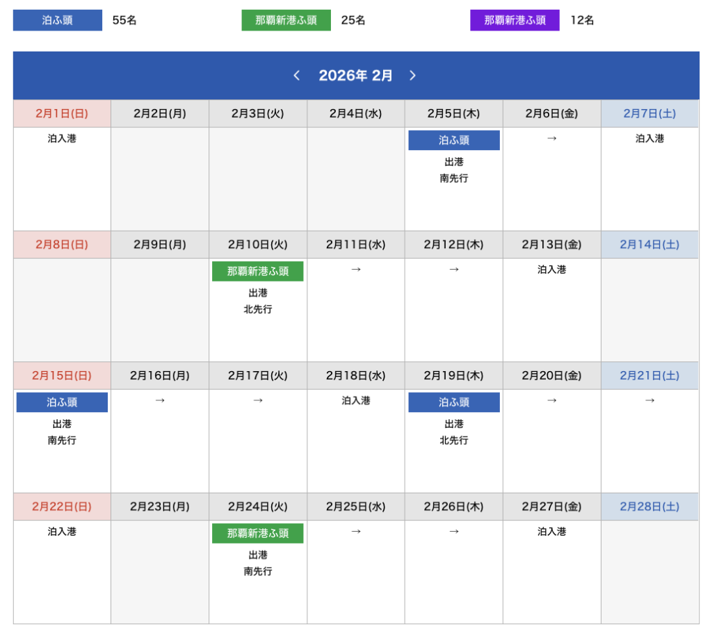 まず、一番難易度が高いのが運航スケジュールを把握するところから。スケジュールは前月20日頃に公開されます。本州から那覇に飛んで旅行する人からすると、直前まで航空券を買えないのが難点(僕は先に航空券を買っていて、たまたま運航スケジュールがピッタリ当てはまったのでフェリー予約しようかな、という具合でした)。