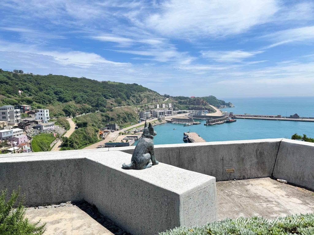 堡の前には、港の方を静かに見つめる銅製の軍用犬像が設置されており、かつてこの拠点が敵の上陸を防ぐために警戒任務を担っていたことを今に伝えています。展望も素晴らしく、眼下には東引中柱港の商店街や港湾エリアが広がり、さらに遠くには東引島と西引島をつなぐ中柱橋を一望できます。