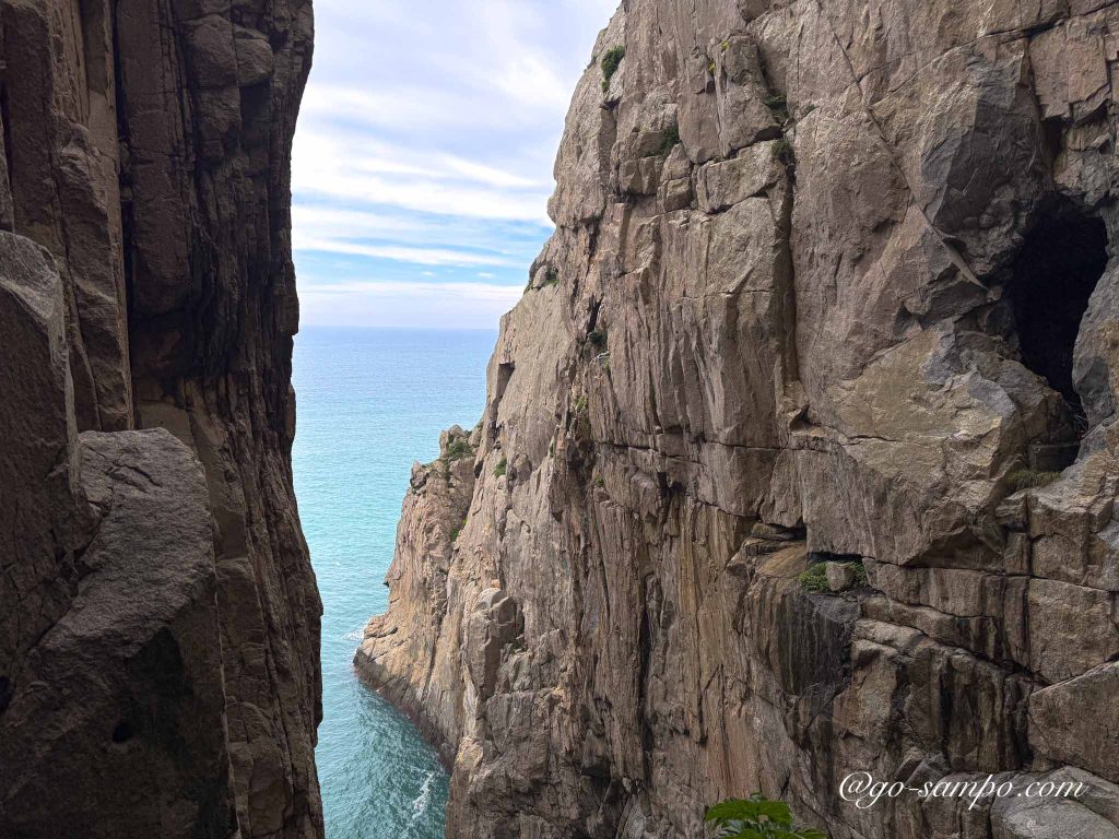 岩壁の間を歩くと、ひんやりとした空気と潮の香りに包まれ、まるで別世界に迷い込んだような感覚を味わえます。写真映えする場所としても人気があり、晴れた日の光の差し込みが特に美しいと評判です。