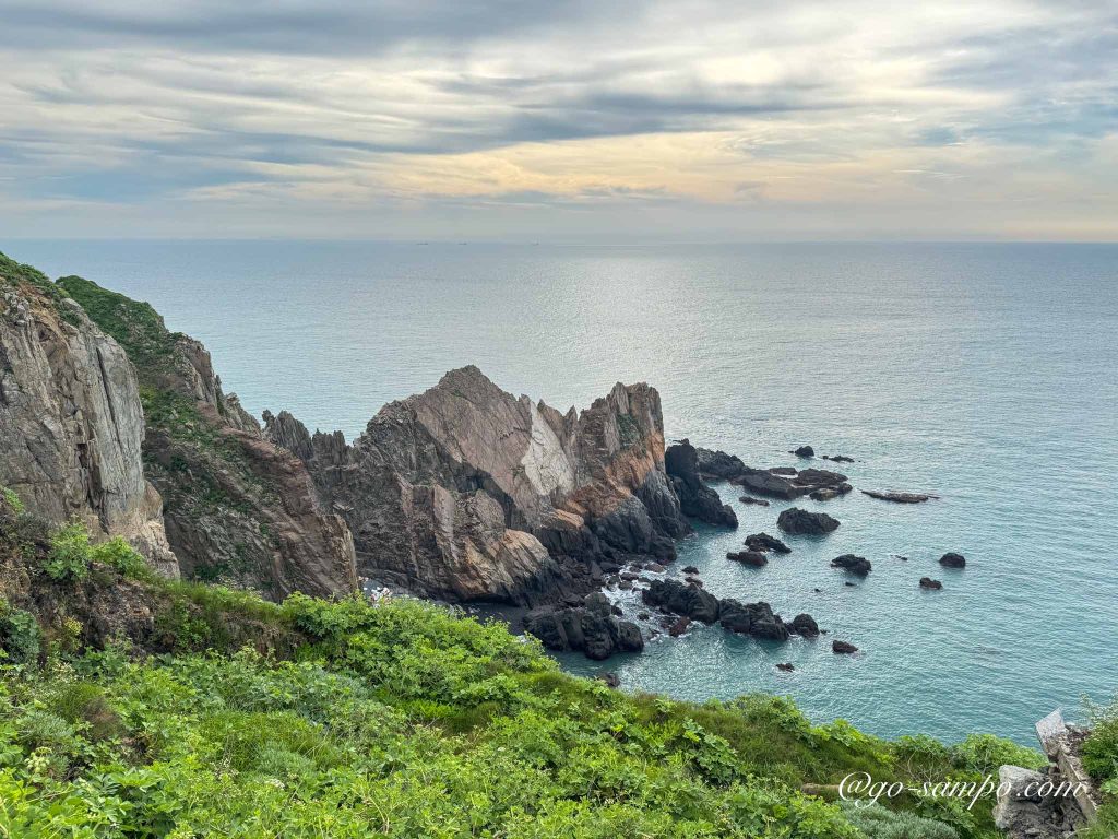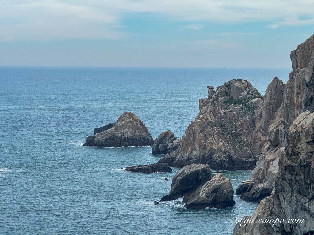 見る角度によって岩の表情が微妙に変わり、朝夕の光が当たる時間帯にはシルエットがよりはっきり浮かび上がります。荒々しい海と調和した自然の芸術品のような景観です。
