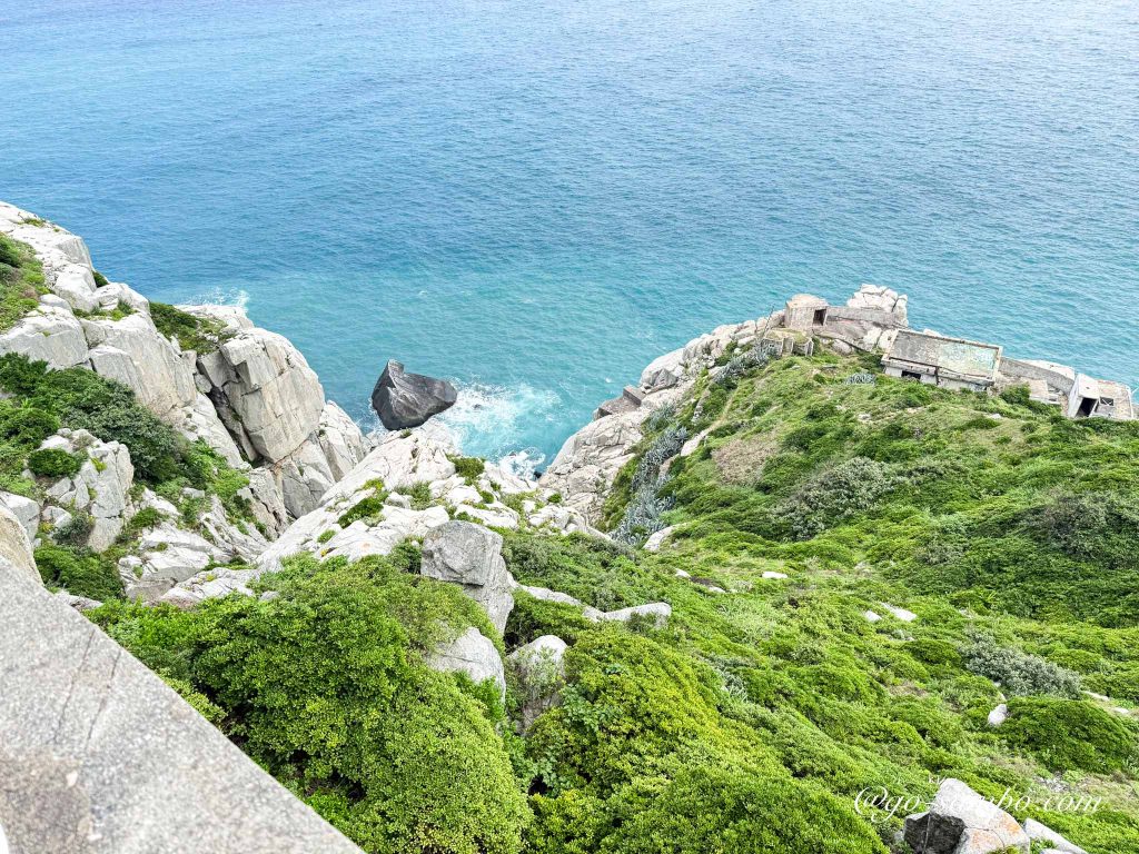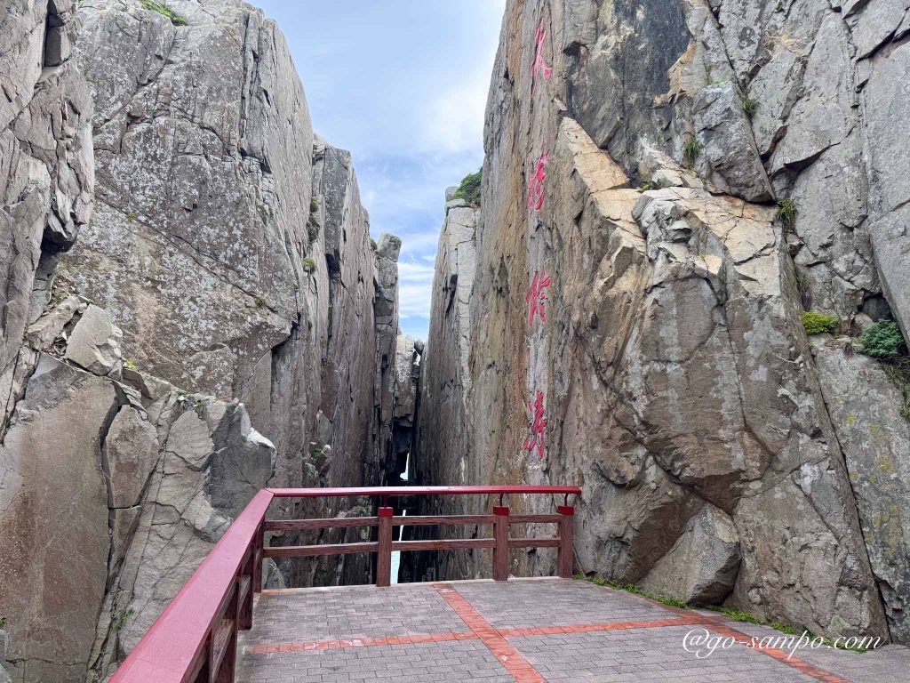 現在は展望台が整備され、深く切り立った岩壁とその下に広がる青い海を見下ろすことができます。岩壁に挟まれた空間に迫り出すように設置された展望台は圧巻です。静かな空気の中に歴史の重みを感じる、東引島の中でも印象的なスポットです。