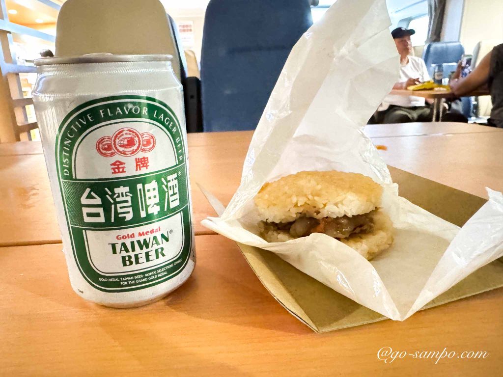 私は売店で台湾ビールとライスバーガーを購入し、ロビー席で簡単に夕食をとりました。次に利用する人は、出航前にコンビニで食料を調達しておくのがおすすめです。