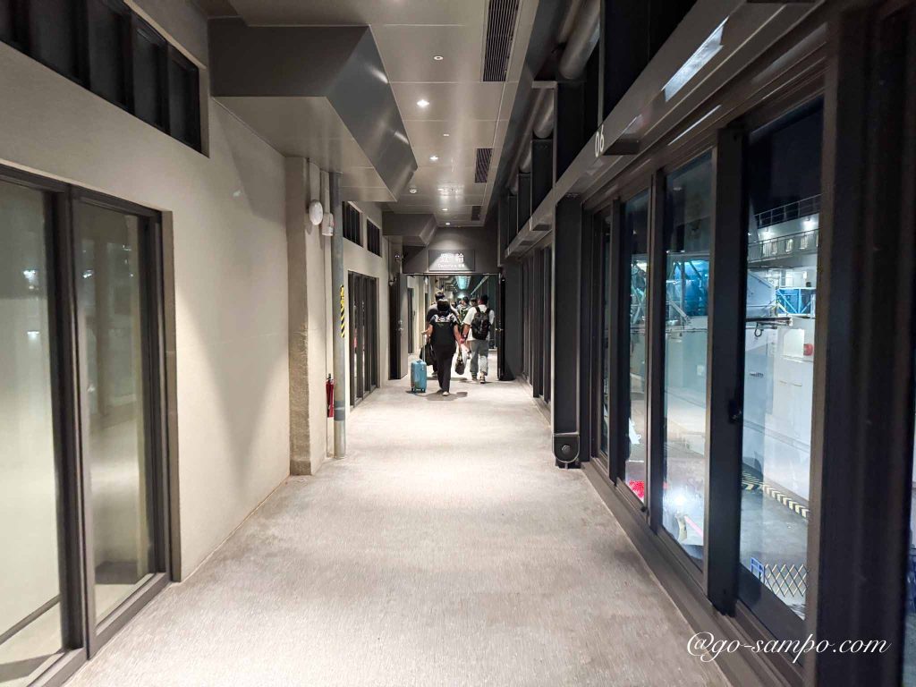 荷物の預け入れは不要(スーツケースごと持ち込みOK)ですが、乗船前に手荷物検査(空港形式のスキャン)を通過して、港の建物2階から船内へ乗り込みます。