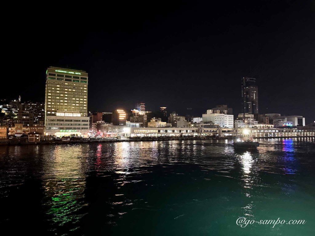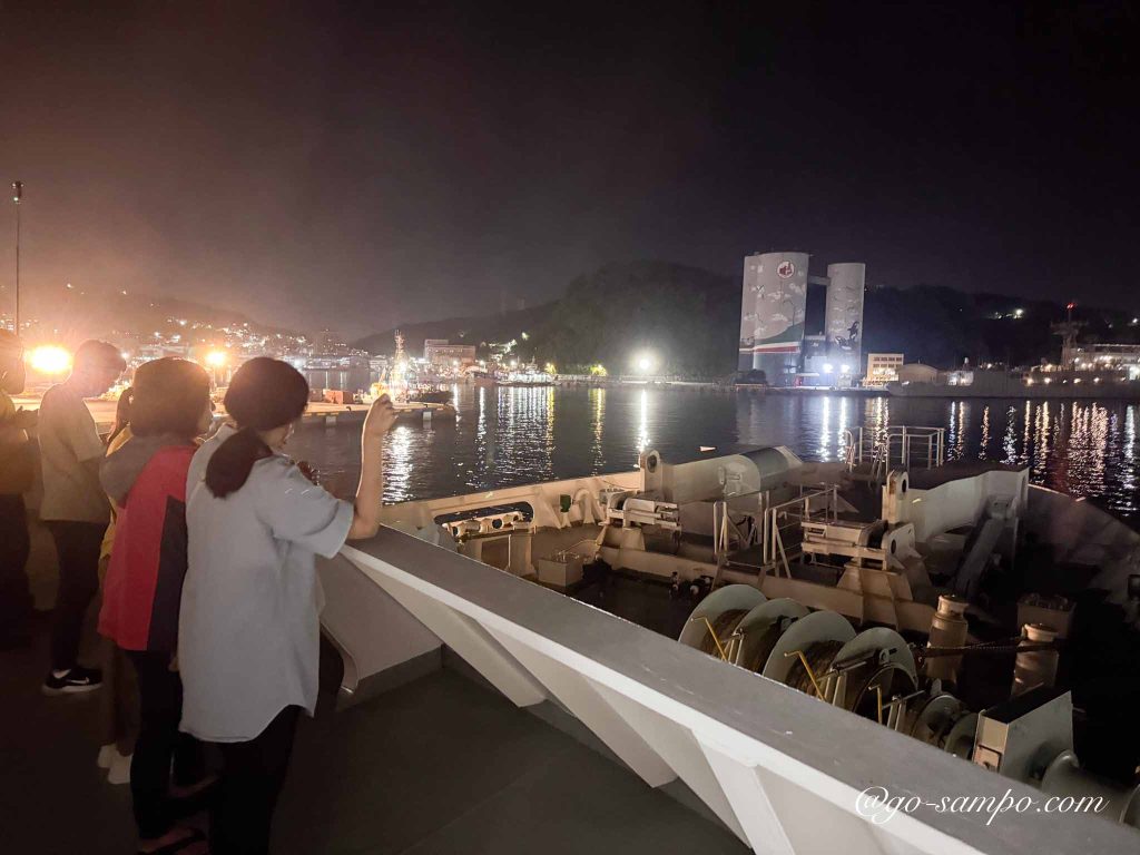 食後はデッキへ出て夜の港を散歩。造船所のライトが海に反射して幻想的な光景でした。